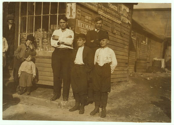 Joseph Dryjowicz, 11 Joy St., (in shirt sleeves). Has been bandboy for 7 months in #8 mill. Group of workers. Location: Ludlow, Massachusetts.
