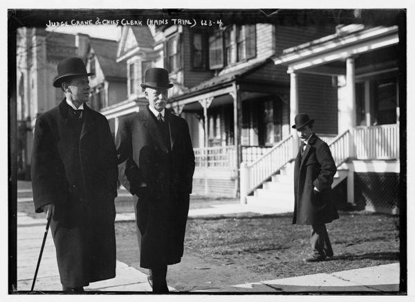 Judge Crane and Chief Clerk during Hains trial, on sidewalk, New York