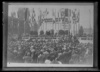 Crowd at ceremony next to tower with flags