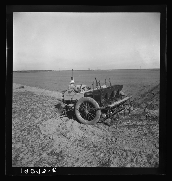 Kern County, California. Large-scale mechanized farming. The potato planter, operated by a crew of three men, makes the rows, fertilizes and plants in one operation