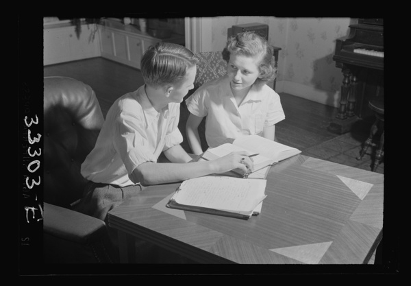 Keysville, Virginia. One of the teachers in the school helping her brother, a pupil, with his studies. He and his brother run a garage at night. All teachers in the school are local