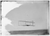 Orville making right turn, showing warping of wings, hill visible in front of him; Kitty Hawk, North Carolina