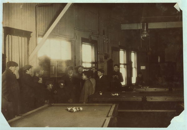 Killing time. Boys and men (many of them workers) hanging around Swifts' Pool Room. Saturday P.M. A common sight any day. Educational influences bad: stories and remarks will not bear repetition. Mill boys and men. Location: Fall River, Massachusetts.