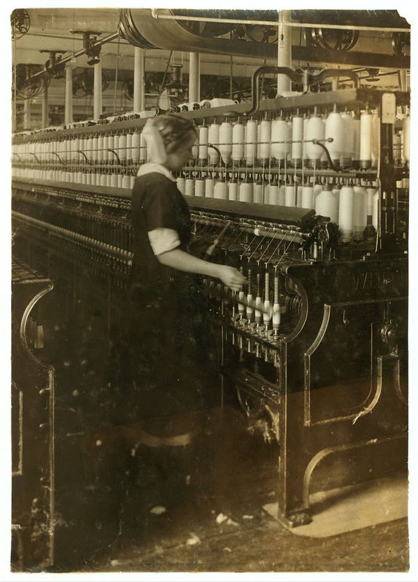 King Philip Spinning Room. Spare Hand on spinning frames Hannah Mills, 603 Dwelly St. 15 years old. Location: Fall River, Massachusetts. / Lewis W. Hine.