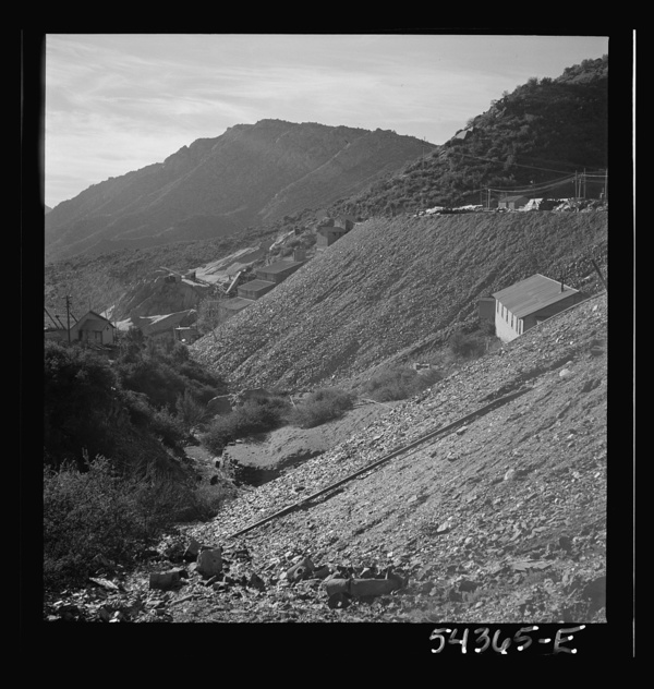 Kingman (vicinity), Arizona. A general view showing a huge waste pile and beyond it the recovery plant where tungsten ore is processed. The ore is mined in the nearby Boriana workings