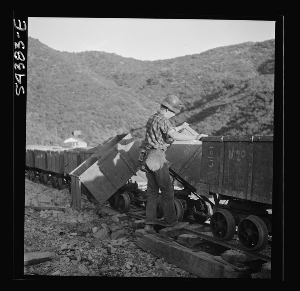 Kingman (vicinity), Arizona. A workman detaching a train of mine cars that have been hauling tungsten ore from the Boriana mine to a recovery plant