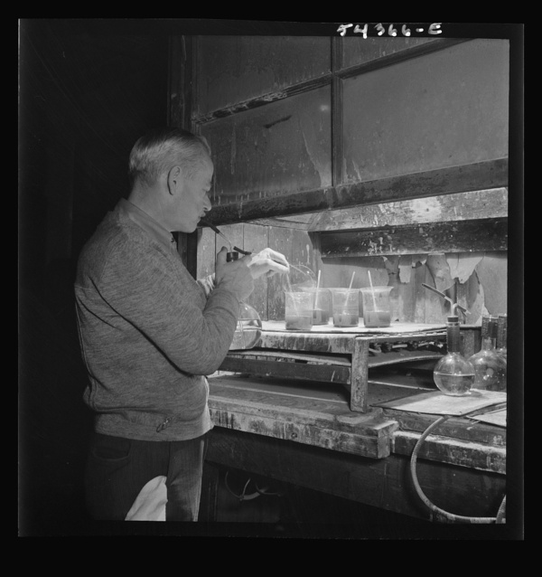 Kingman (vicinity), Arizona. Mr. Relling, scientist in the laboratory of a concentrating plant, analyzing tungsten ore over a hot plate
