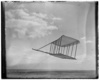 Left side view of the 1900 Wright glider before installation of forward horizontal control surface, flying as a kite, tipped forward; Kitty Hawk Lifesaving Station and Weather Bureau buildings in background to the left
