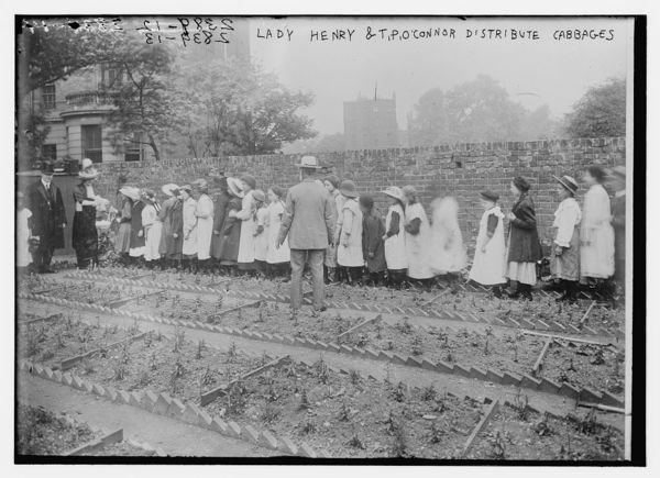 Lady Henry and T.P. O'Connor distribute cabbages