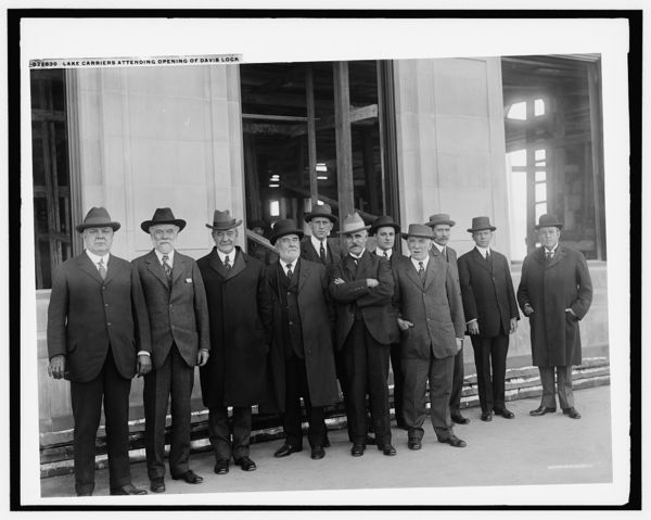 Lake carriers attending opening of Davis lock, Sault Sainte Marie canal