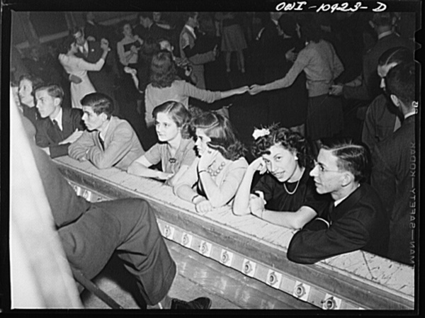 Lancaster, Pennsylvania. Company dance given in Moose Hall so that the Hamilton Watch Company new employees might get acquainted. Jazz fans listening to the orchestra