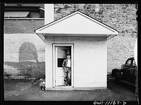 Lancaster, Pennsylvania. Parking lot. Mural painting at left shows a tramp fishing by a stream