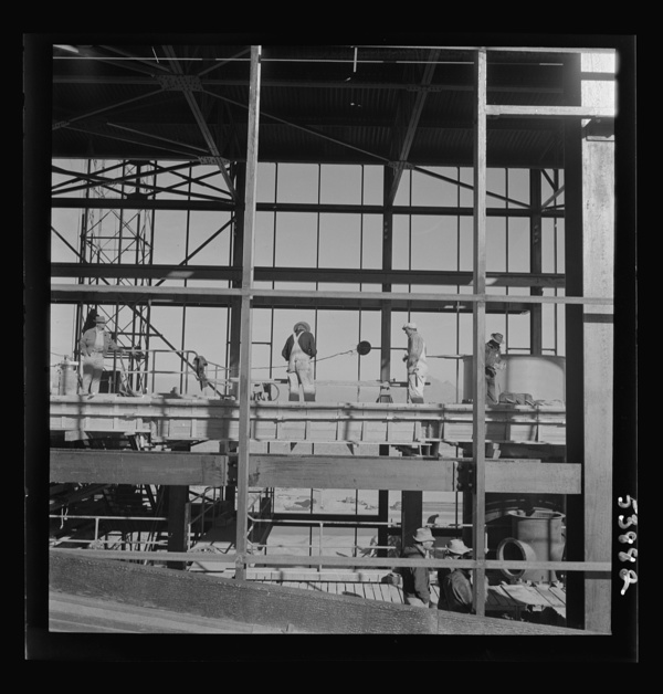 Las Vegas, Nevada. A construction scene at the Basic Magnesium Incorporated plant in the southern Nevada desert, showing workmen engaged in the steel structure of one of the chlorination plants