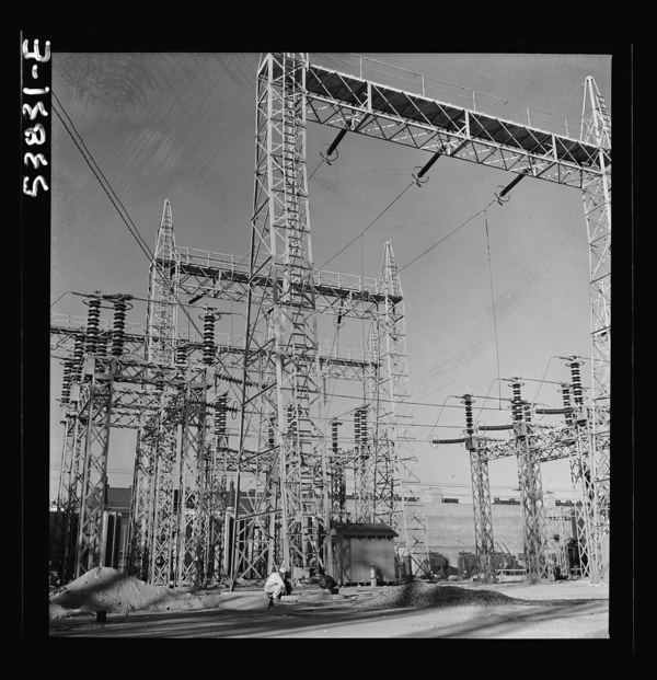 Las Vegas, Nevada. A mass of transmission towers and transformers redistributing power from Boulder Dam to Basic Magnesium Incorporated, which produces huge quantities of the lightest of all metals for aircraft and other wartime manufacturing