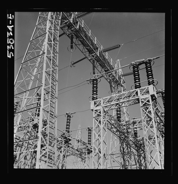 Las Vegas, Nevada. Transmission towers and transformers redistributing power from Boulder Dam to Basic Magnesium Incorporated, which produces huge quantities of the lightest of all metals for aircraft and other wartime manufacturing