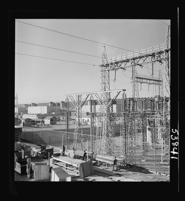 Las Vegas, Nevada. Transmission towers and transformers redistributing power from Boulder Dam to Basic Magnesium Incorporated, which produces huge quantities of the lightest of all metals for aircraft and other wartime manufacturing