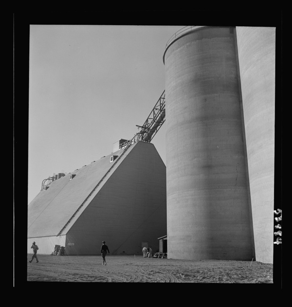 Las Vegas, Nevada. Giant silos, eighty-four feet high, for the storage of ore for the manufacture of magnesium, and a peat-storage building on the grounds of Basic Magnesium Incorporated