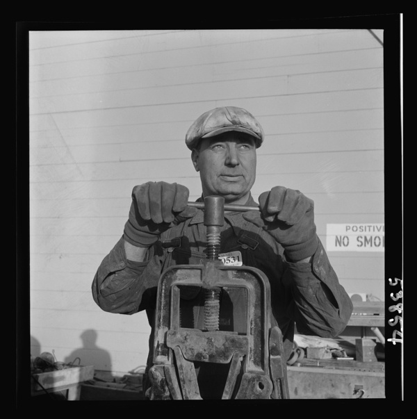Las Vegas, Nevada. One of the construction workers at the Basic Magnesium Incorporated plant, working at the pipe vise. He is working on a building near the peat storage building near which he is standing