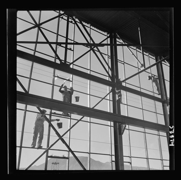 Las Vegas, Nevada. Painters at work seventy feet above ground on the gigantic construction of the Basic Magnesium Incorporated plant in the southern Nevada desert. A tower of another building and mountain tops can be seen in the background
