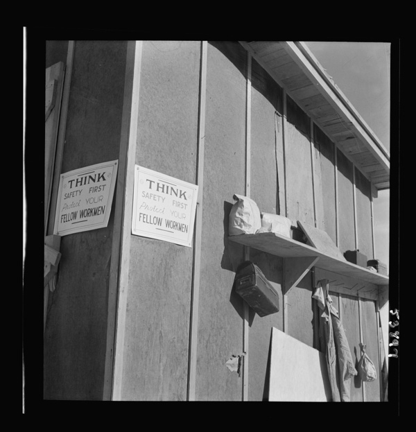 Las Vegas, Nevada. The wall of a tool shed showing a shelf with lunch pails and overalls, and a poster reading "THINK. Safety First. Protect Your Fellow Workmen," at the Basic Magnesium incorporated plant under construction in the southern Nevada desert