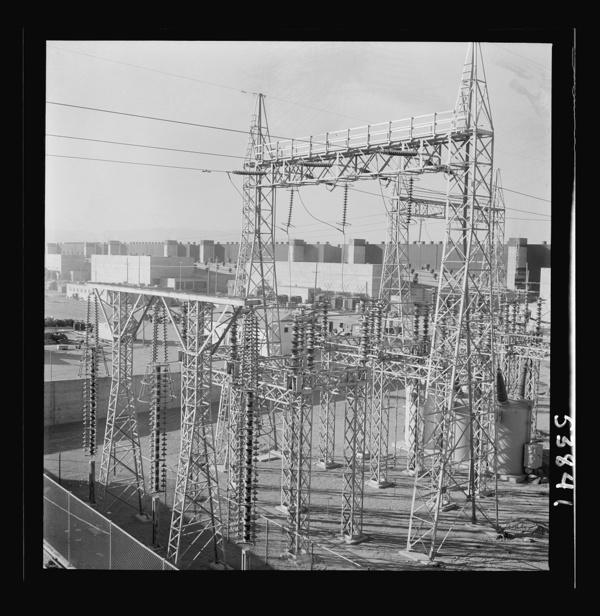 Las Vegas, Nevada. Transmission towers and transformers redistributing power from Boulder Dam to Basic Magnesium Incorporated, which produces huge quantities of the lightest of all metals for aircraft and other wartime manufacturing