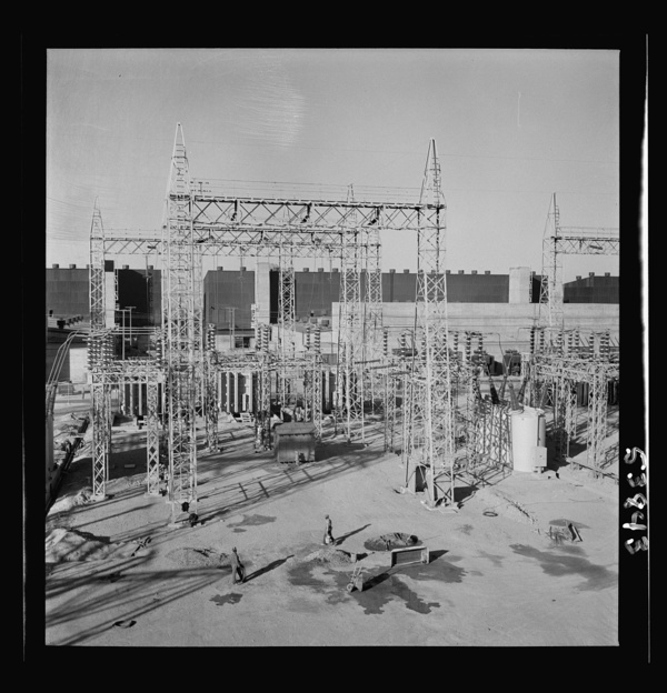 Las Vegas, Nevada. Transmission towers and transformers redistributing power from Boulder Dam to Basic Magnesium Incorporated, which produces huge quantities of the lightest of all metals for aircraft and other wartime manufacturing