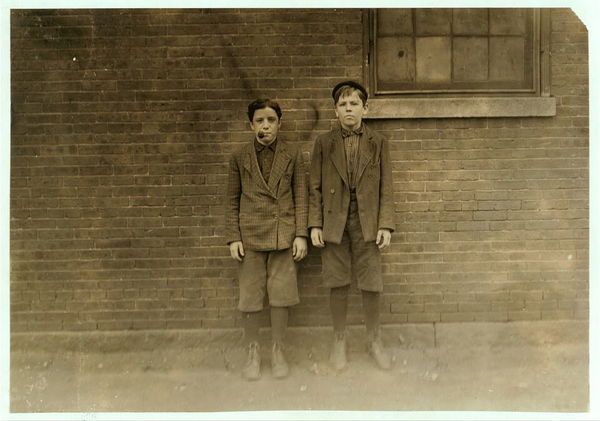 Left hand boy Zeke Gosselin, 95 Main St. Been in mill one year. Other boy Philip Lesard, 68 Elm Street. Been in mill three years. Working in Great Falls Manufacturing Co. Location: Somersworth, New Hampshire.
