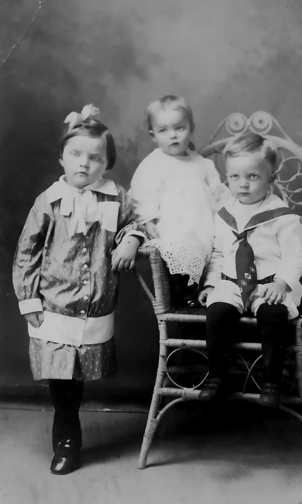 Left to right: My Aunt Neola, Aunt Grace and my father John W Parker in Tuscola, Illinois. 1913