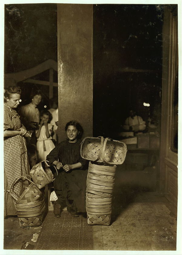 Lena Lochiavo, 11 years old, Basket Seller, Sixth St. Market, Cincinnati O. Saloon entrance. 11 P.M. Had been there since 10 A.M. and not yet sold out. Location: Cincinnati, Ohio.