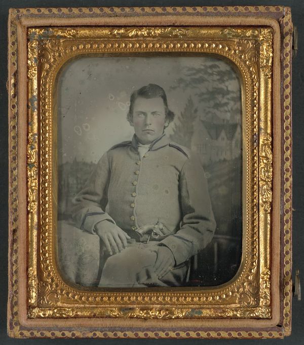 Lewis Hicks of Company H, 53rd North Carolina Infantry Regiment with pistol in front of painted backdrop showing a gabled house