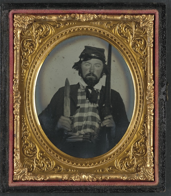 Lieutenant Hiram L. Hendley of Co. A, 9th Tennessee Cavalry Battalion with double barrel shotgun and Bowie knife