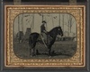 Unidentified soldier in Union cavalry uniform, on horse, with cavalry saber, in front of encampment with winter chimneys
