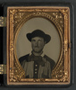 Unidentified soldier in Confederate uniform with double barrel shotgun, Bowie knife, and two pistols