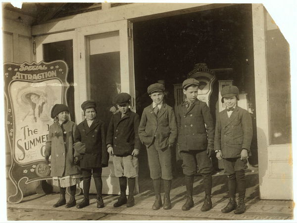Newsie, ten years old. Going into a moving picture theatre with his papers. Location: Schenectady, New York (State)