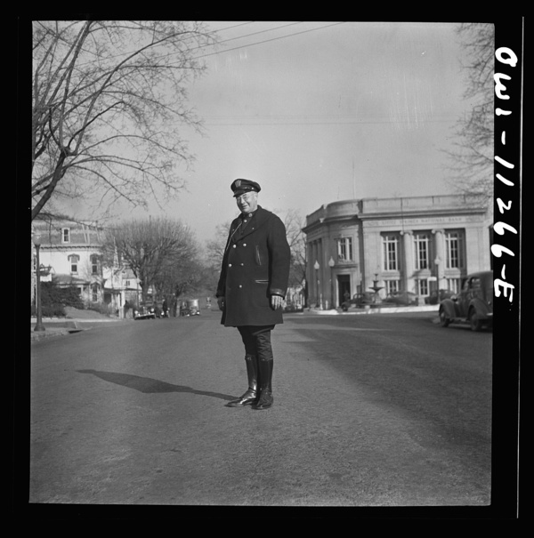 Lititz, Pennsylvania. "Bosser" Kreider, day policeman, during an air raid drill