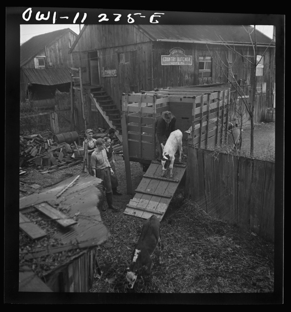 Lititz, Pennsylvania. Unloading calves and pig purchased at the union stockyards in Lancaster at Lutz's slaughterhouse