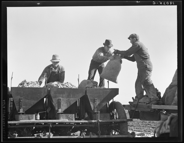 Loading bins of potato planter which fertilizes and plants potatoes in one operation. Kern County, California