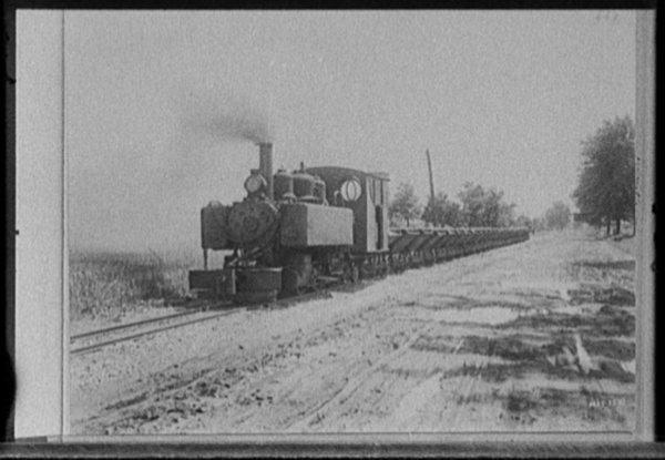 Locomotive pulling cars alongside road, possibly road construction in Michigan