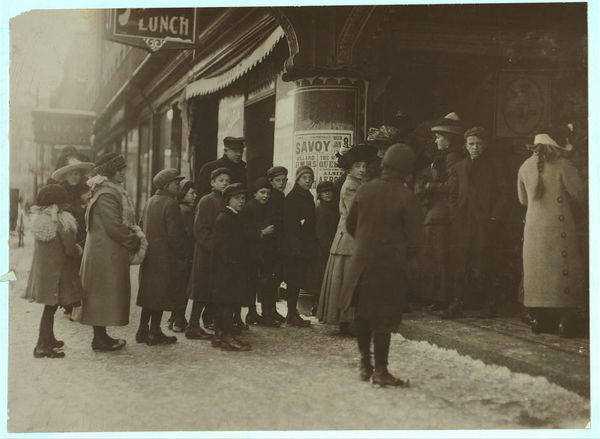Long line of boys and men at Vaudeville Show. Saturday P.M. Location: Fall River, Massachusetts.