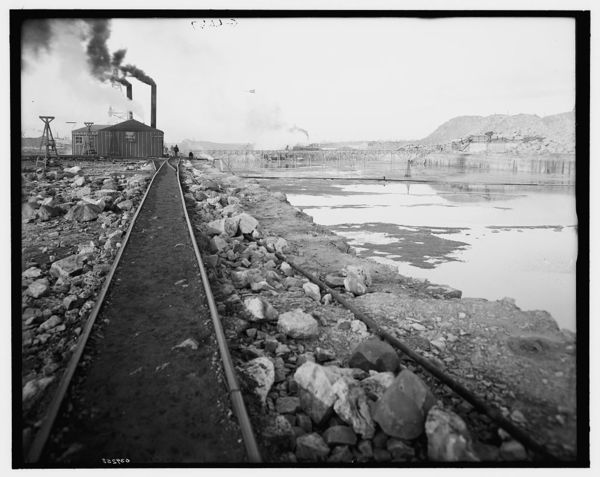 Steam shovel removing a section of coffer dam, Livingstone Channel, Detroit, Mich.