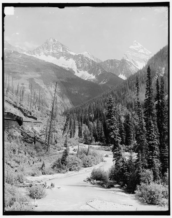 Up Illecillewaet Valley from railroad bridge, Selkirk Mountains, B.C.