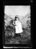 Girl, probably Hallie Jackson, in white dress posed against rock in studio background