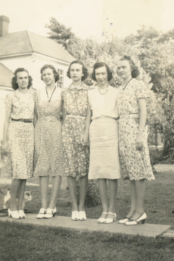 L-R: Martha, Frances, Alice (Kitty), Georgia, and Mary Lois Moffett in front of their house at 568 South Main Street in Lawrenceburg, Kentucky, likely spring 1939