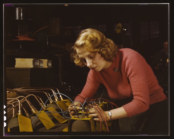 Lucile Mazurek, age 29, ex-housewife, husband going into the service, working on black-out lamps to be used on the gasoline trailers in the Air Force, Heil and Co., Milwaukee, Wisc.