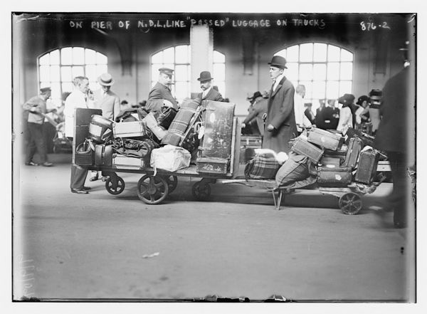 Luggage from boat on baggage carts, pier of N.D.L. Line