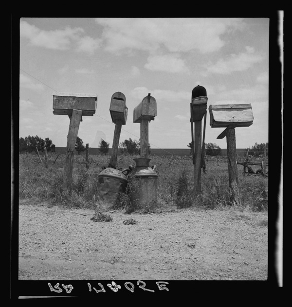 Mail boxes in Bell County, Texas. Three of these mail boxes are not in use. The tenant farmers have been replaced by tractor farming