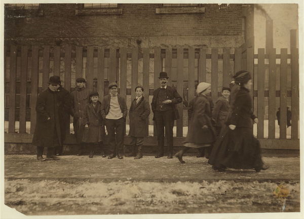 Main Entrance Wamsutta Mills. Young workers also indolescent i.e., adolescent and young girls running the gauntlet of vile-speaking men and boys. The remarks are sometimes beyond belief. Location: New Bedford, Massachusetts.