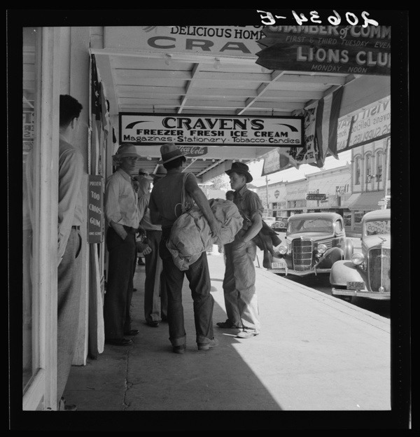 Main street, in front of Oregon Employment Center office. Man with blanket roll is Indian, come to find job in hop fields. Independence, Polk County, Oregon. See general caption number 45-111