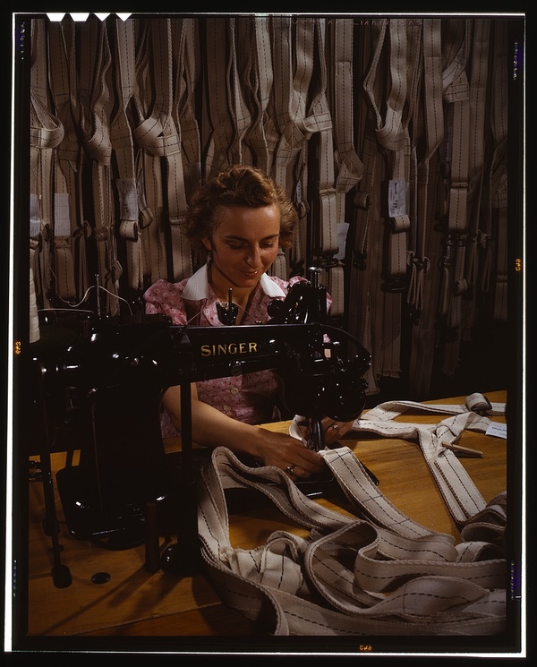 Making harnesses, Mary Saverick stitching, Pioneer Parachute Company Mills, Manchester, Conn.