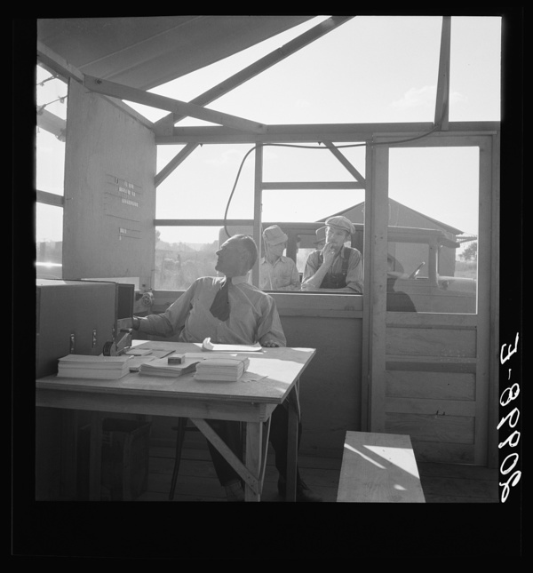 Manager of mobile unit (FSA - Farm Security Administration) on day camp opened, in registration tent. Merrill, Klamath County, Oregon. General caption number 62-1